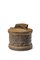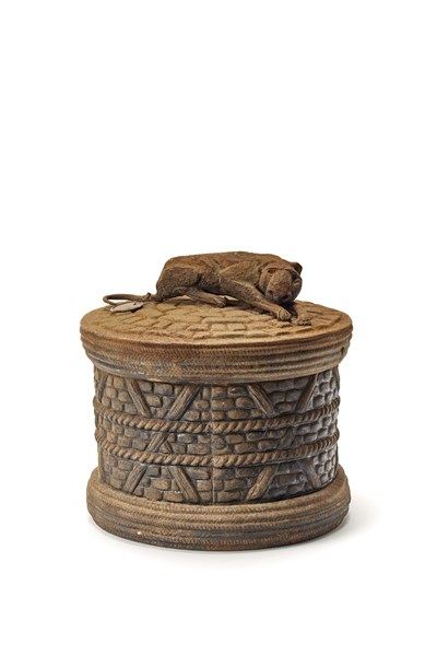 Scatola con coperchio in lamina di ferro battuto sbalzata a figurare cordame e un'orditura muraria e lignea. Coperchio decorato con sculturina a tutto tondo raffigurante un leone accovacciato. Venezia, 1925ca (h cm 20; d cm 21) (difetti)