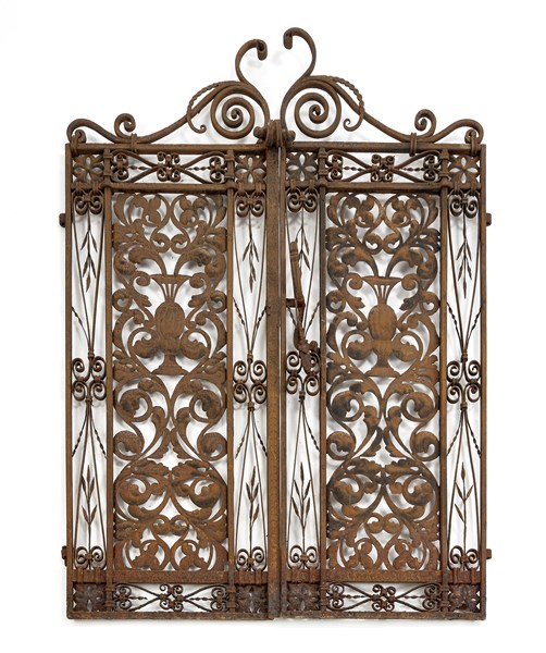 Two-leaf wrought iron gate, decorated with a central cup motif, jets and volutes in embossed iron foil, lateral panels decorated with geometric motifs and olive branches, structural uprights with circular Greek. Venice, 1910s/1920s. (105x147 cm.) (slight defects)
