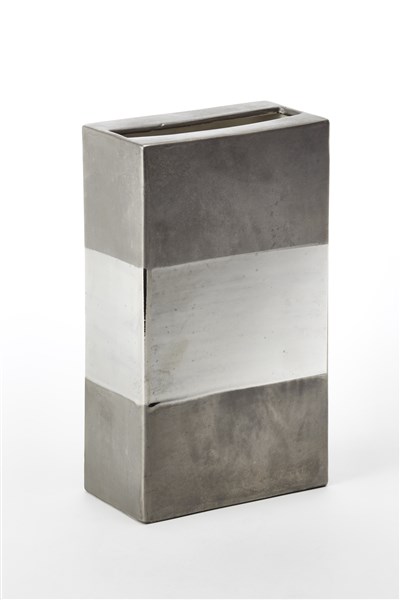 Enamelled platinum and grey ceramic vase. Produced by Società Ceramica Toscana per Il Sestante, 1962-1963. Signed under the base "SOTTSASS IL SESTANTE 588 ITALY". (15x26.5x7.8 cm.) (slight defects)