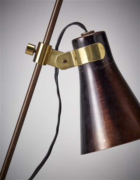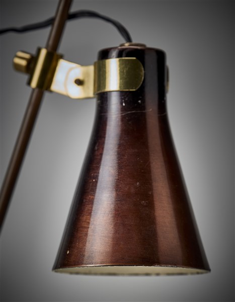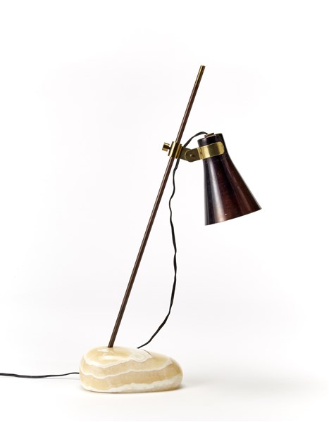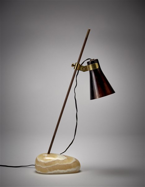Lampada da tavolo modello "LTA1 Sasso". Produzione Azucena, Milano, disegno del 1948, esemplare del 1955 ca. Base in ciottolo di fiume levigato, asta sfilabile in ottone, snodi in ottone, riflettore in alluminio brunito. (l asta cm 38) (leggeri segni d'uso)