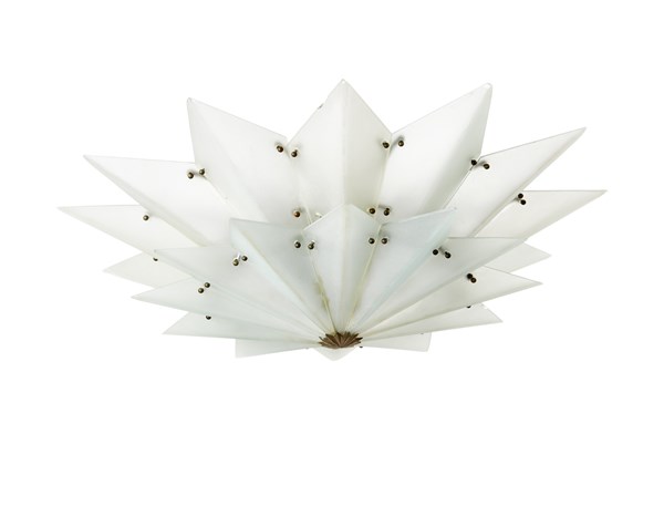 Suspension lamp. Paris, 1925ca. Structure in cast bronze, twenty-four opalescent satin glasses on the external surface supported by spherical brass bolts. (h 40 cm.; d 80 cm.) (slight defects and small losses)