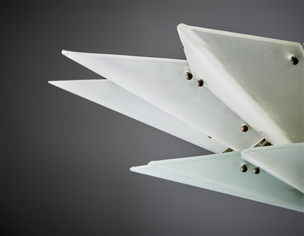Lampada a sospensione. Parigi, 1925ca. Struttura in fusione di bronzo, ventiquattro vetri opalescenti satinati sulla superficie esterna retti da bulloni sferici in ottone. (h cm 40; d cm 80) (lievi difetti e piccole mancanze)