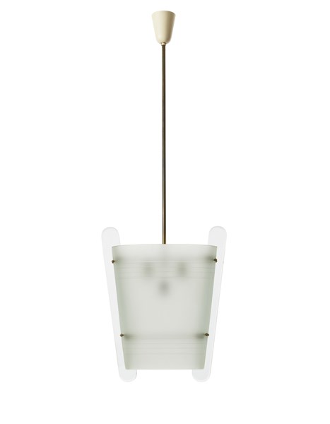 Suspension lamp with three lights. Milan, 1940ca. Two curved and satin-finished crystals on the external surface, structure in brass and white painted metal. (h 120 cm.; d 41 cm.) (slight defects)