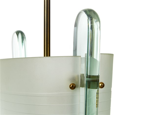 Lampada a sospensione a tre luci. Milano, 1940ca. Due cristalli curvati e satinati sulla superficie esterna, struttura in ottone e metallo verniciato bianco. (h cm 120; d cm 41) (lievi difetti)