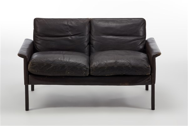 Divano a due posti imbottito e rivestito in pelle testa di moro. Struttura in legno massello. Produzione CS Mobler, Danimarca, 1962ca. (cm 130x71x73) (difetti)