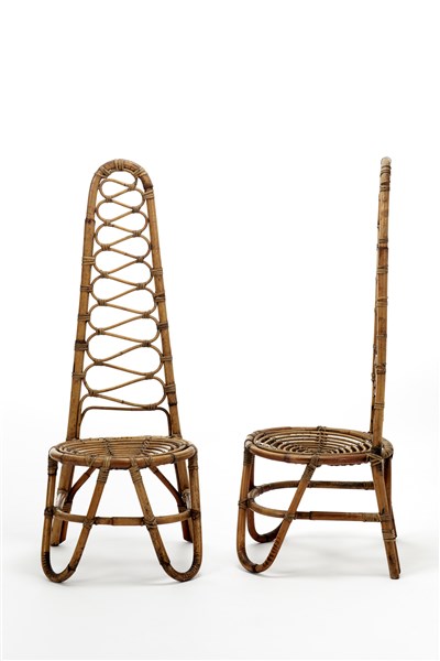 Pair of high-backed rattan and rattan chairs. Italy, 1950s. (h 114 cm.; d 42 cm.) (slight defects)