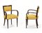 Coppia di poltroncine con seduta imbottita e rivestita in velluto giallo, struttura in legno massello di mogano. Gambe anteriori troncoconiche. Italia, anni '50. (cm 60x83,5x52) (lievi difetti e restauri)