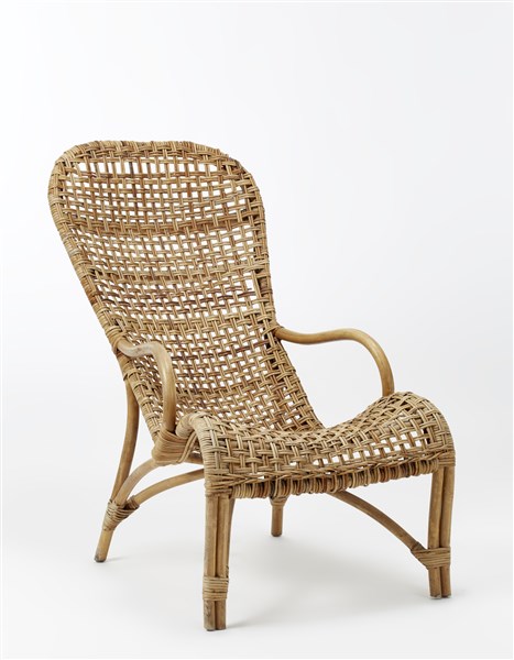Armchair in rush and rattan. Italy, 1950s. (60x94x95 cm.) (slight defects)