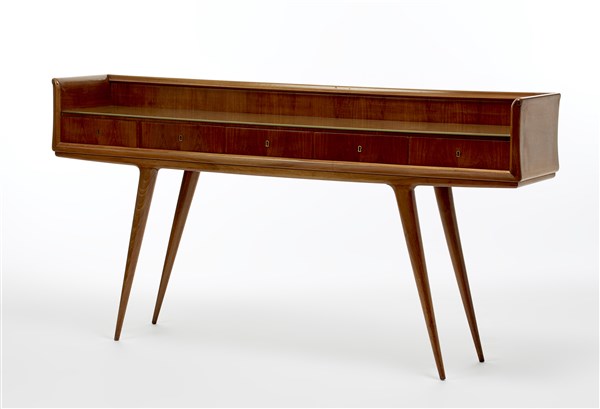 Console in solid walnut, veneered and edged with five drawers and back-painted glass top. Italy, 1940s/1950s. (188x96x40 cm.) (slight defects)