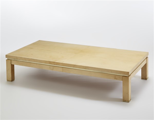 Tavolino da salotto con gambe e piano in legno rivestiti in pergamena bianca trattata con vernice trasparente al poliestere, elementi in ottone. Italia, anni '50/'60. Recante firma indecifrata sul fianco. (cm 180x37,5x90) (difetti)