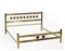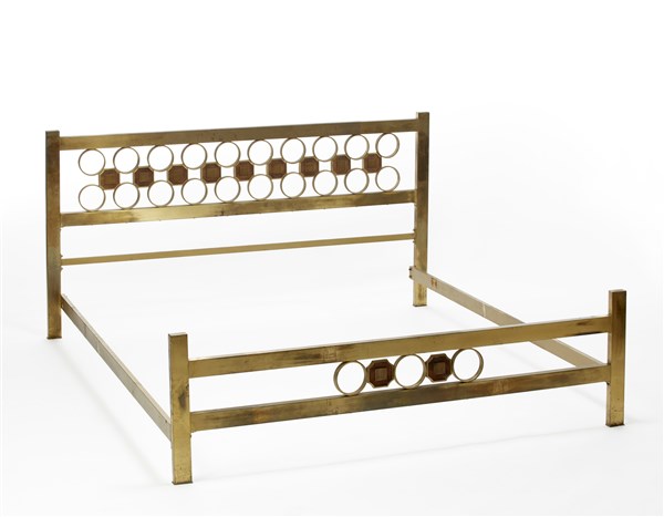 Letto matrimoniale in ottone e metallo verniciato beige. Testata decorata con formelle e cerchi. Italia, anni '70. (cm 182x93,5x199,5) (lievi difetti)