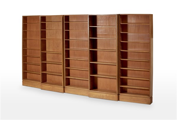 Lotto di cinque librerie di diversa profondità in stile Novecento con ripiani a giorno regolabili. Milano, anni '30. Legno di noce massello, bordato e impiallacciato. (cm 80x210x26/20) (difetti)