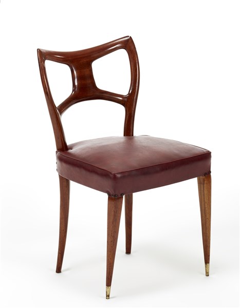 Sedia con schienale a giorno. Italia, 1950ca. Legno di mogano con seduta imbottita e rivestita in vinilpelle bordeaux. Puntali delle gambe anteriori in ottone. (cm 46x79x50) (lievi difetti e piccolissime mancanze)