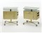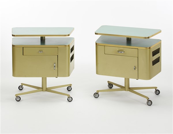 * Lotto di due comodini su ruote ad un cassetto, un'anta, due ripiani a giorno e una tasca porta riviste su un lato. Produzione Officine Valsecchi, Milano, 1957. Acciaio stampato e verniciato color verde metallizzato, piani rivestiti in formica verdina, bordure in alluminio ottonato. (cm 66x74,5x35,5) (lievi difetti e piccole mancanze)