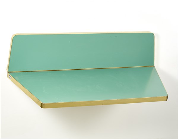 * Tavolo a parete pensile a ribalta. Produzione Officine Valsecchi, Milano, 1957. Struttura in legno, piano in formica verde bordato in alluminio ottonato. (cm 110x74,5) (lievi difetti)