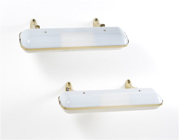 * Coppia di lampade da parete. Milano, 1957. Struttura in fusione di alluminio ottonato, diffusore in metacrilato bianco opaco. (l cm 73) (lievi difetti)