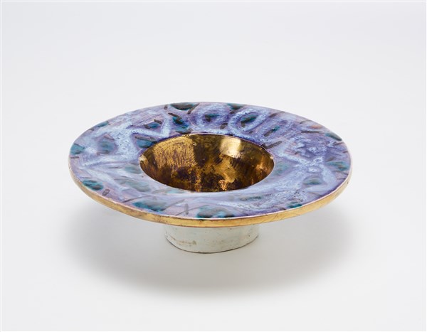 Eduard Cazaux Coppa circolare in ceramica smaltata in oro e viola, decorata con