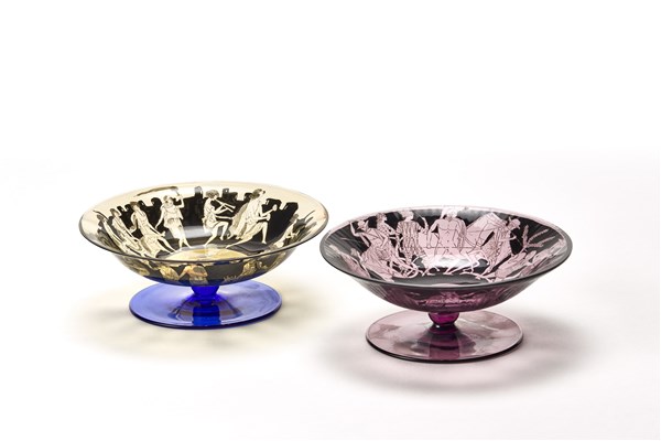 Lotto di due alzatine in vetro rispettivamente blu/pagliesco e ametista, dipinte a mano con scena greca. Firmate “XIV Vedar” e “Mild,h”. Milano, 1936ca. (d cm 12 e d cm 12,5; h cm 4,8) (lievi difetti su quella firmata “Vedar”)