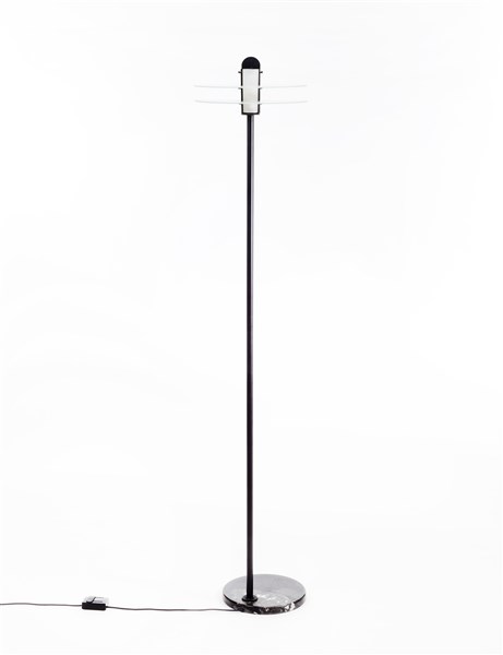 Lampada da terra. Produzione Quattrifolio, Italia, 1985. Fusto in ferro verniciato nero, basamento in marmo e due dischi diffusori in vetro temperato satinato. (h cm 208) (lievi difetti e mancanze)