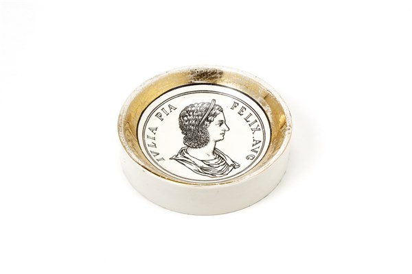 Svuotatasche. Milano, anni '60. Porcellana serigrafata in nero, bordo dorato. Marcato al verso. (h cm 3; d cm 13) (difetti)