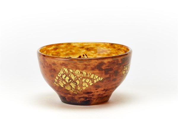 Small double glass cup with spotted decoration imprisoning pure gold leaves interspersed between two layers. 1910ca. Signature engraved "Daum Nancy" with the cross of Lorraine. (h 6 cm.; d 11 cm.)