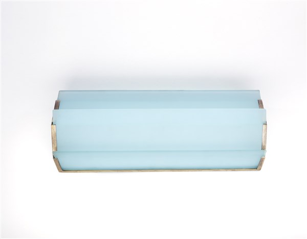 Geometric Déco wall lamp with pentahedral-shaped brass structure, diffuser screens in satina glass plates. France, 1925ca. (l 46 cm.) (slight defects)