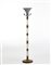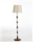 Lampada da terra con base in ottone e fusto formato da coni di vetro soffiato costolato trasparente incolore inframmezzati da sfere in ottone, attacco in alluminio e diffusore in raso color creme. Anni '40. (h tot cm 186) (lievi difetti)