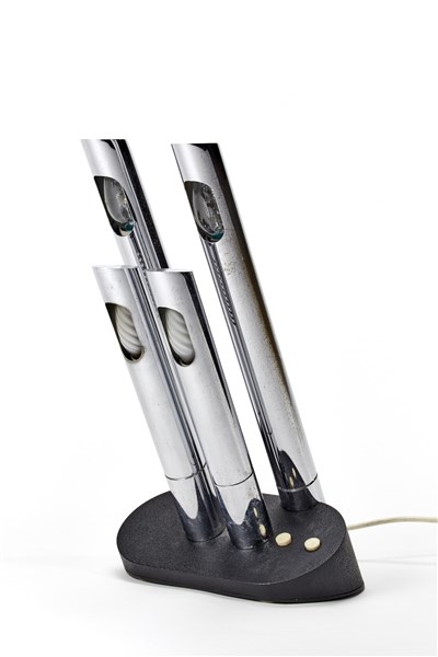 Lampada da tavolo modello "President Mid-Century". Produzione Luci, Italia, 1969. Diffusori in acciaio, base in metallo verniciato nero. Recante marchio del produttore. (h cm 41)