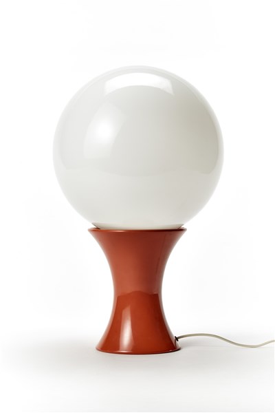 Table lamp. Italy, 1970s. Orange painted metal base, lattimo glass lampshade. Bearing the manufacturer's paper label. (h 50 cm.)