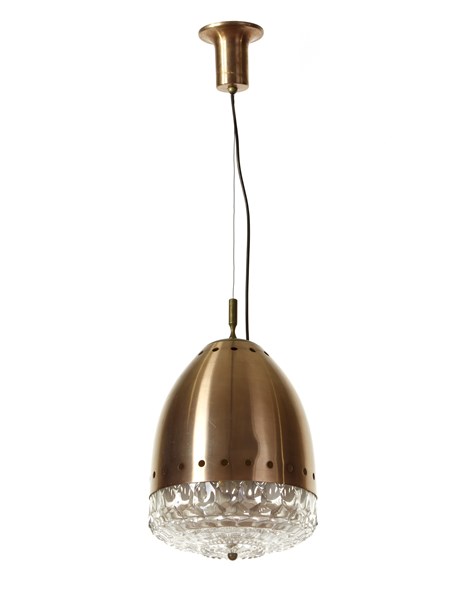 Lampada a sospensione con calotta e attacco in metallo nichelato, diffusore in vetro stampato trasparente incolore. Italia, anni '70. (h cm 88; d cm 28) (lievi difetti)