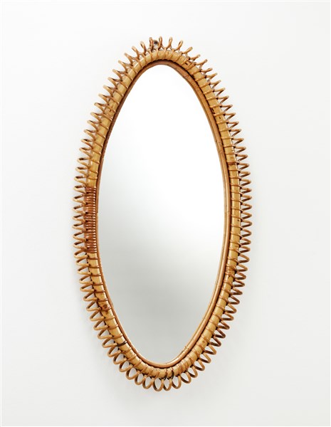 Specchio da parete di forma elissoidale con cornice in giunco e malacca. Italia