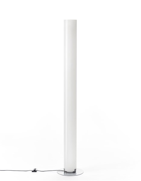 Floor lamp model "Stylos". Produced by Flos, Milan, 1984. Base in gray and white painted steel, gray plastic, diffuser body in opal methacrylate. (h 198 cm.)