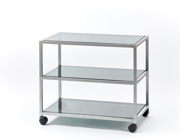 Carrello a tre ripiani. Bregnano, anni '80. Struttura in metallo cromato e piani in vetro fumè. (cm 75x64x45) (lievi difetti)