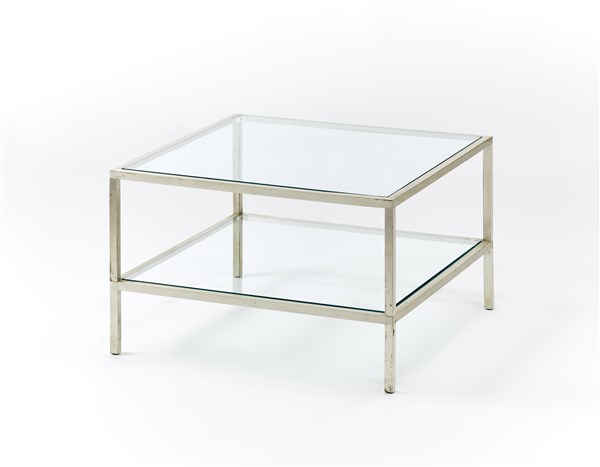 Tavolino/comodino con due ripiani. Bregnano, anni '80. Struttura in metallo argentato spazzolato e piani in cristallo. (cm 70x43x70) (difetti)