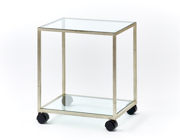 Carrello a due ripiani. Bregnano, anni '80. Struttura in metallo argentato satinato e piani in cristallo. (cm 44,5x50x35) (lievi difetti)