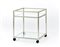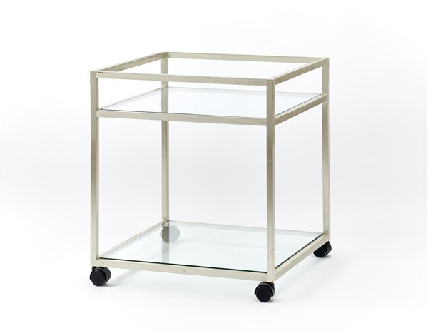 Carrello/comodino a due ripiani. Bregnano, anni '80. Struttura in metallo argentato satinato e piani in cristallo. (cm 60x66x60) (difetti)