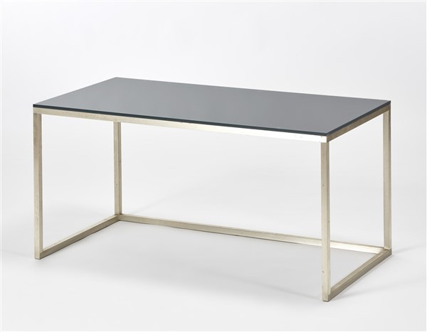 Tavolo da salotto. Bregnano, anni '80. Piano in vetro retroverniciato e struttura in metallo argentato spazzolato. (cm 104x50x53) (lievi difetti)