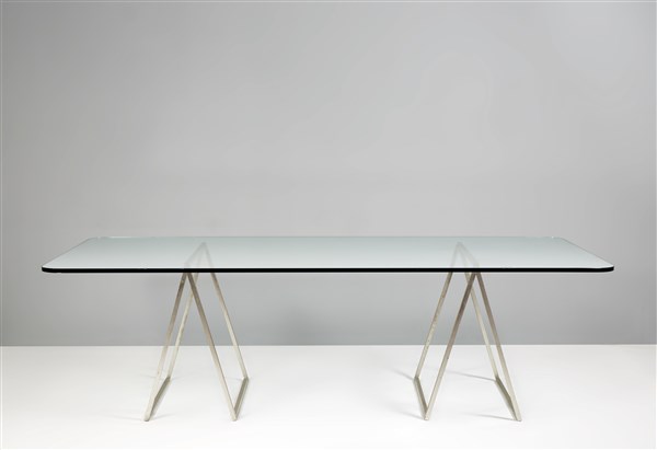 Tavolo. Bregnano, anni '80. Piano in cristallo di forte spessore e gambe a cavalletto in metallo argentato spazzolato. (cm 249x73x110) (difetti)