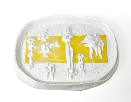Scultura in biscuit smaltata bianca e gialla opaca. Produzione Ars Porcellana Rosenthal, Germania. Monogrammata, firmata e numerata "Ars Porcellana - Rosenthal relief reihe 11/50" al verso. (cm 60x48)
