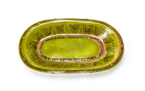 Grande centrotavola in ceramica smaltata sotto vetrina nei toni del verde e bruno. Manifattura di Nove, anni '60/'70. Marcato sotto la base. (cm 70x8x41)