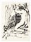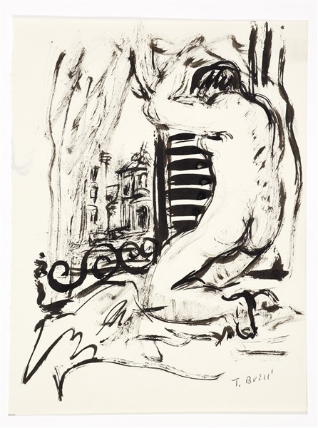 Female nude portrait inside a bedroom, looking out the window framing a glimpse of the city with a baroque church (Rome? Venice?). Italy, 1950s. Black India ink on "I" paper. Signed lower right. (22.2x16 cm.) (slight defects)