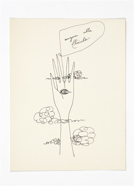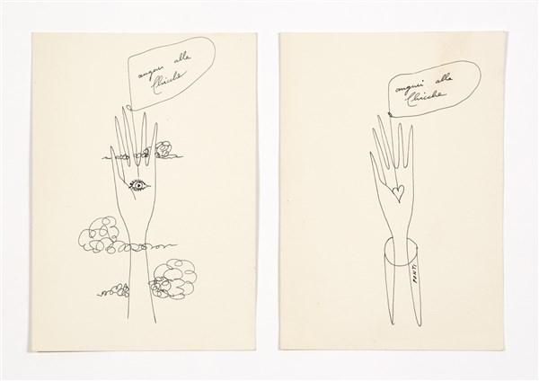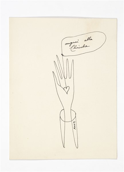 Due biglietti augurali. Milano, anni '50. Composizione rispettivamente di una mano e un cuore, firmata "PONTI" e di una mano con nuvole e un occhio. Inchiostro nero su cartoncino. (cm 15x10,5) (lievi difetti)