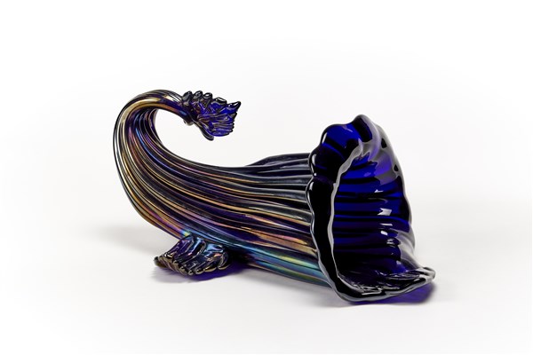 Grande cornucopia in vetro soffiato blu a profonde costolature, fortemente iridato sulla superficie esterna. Seguso Vetri d'Arte, Murano, anni '60/'70. Firmato a punta sotto una foglia "Seguso VA Murano". (cm 45x22x28)