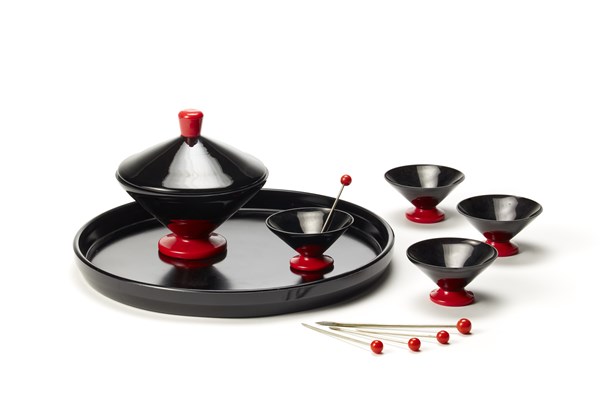 Servizio da cocktail Art Déco, composto da un vassoio, un portaciliegie, quattro bicchierini e cinque stuzzicadenti in vetro nero opaco. Basi applicate in vetro rosso opaco. Murano, anni '20/'30. (d cm 27) (lievi difetti)