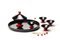 Art Déco cocktail service, consisting of a tray, a cherry holder, four small glasses and five toothpicks in matt black glass. Applied bases in opaque red glass. Murano, 1920s/1930s. (d 27 cm.) (slight defects)
