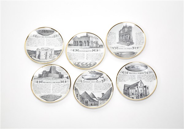 Piero Fornasetti Sei piatti della serie "Specialità Pugliesi". Produzione Fornas