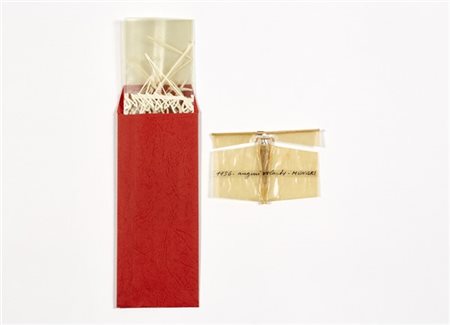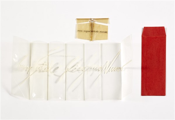 Lot consisting of a small "macchina inutile" in wood, metal wire, white bead and tracing paper, self-made for inaugural purposes and handwritten "1956.auguri volanti. Munari" (cm 6,5x9), together with a greeting card printed on acetate, personalized for Enrichetta Ritter and signed "MUNARI", folded in a red paper envelope (42x16 cm). Milan, 1950s. (slight defects)