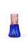 Vaso con corpo cilindrico in vetro soffiato trasparente incolore con inclusione di murrine rosse, arancioni, ametista e ocra. Base troncoconica in vetro costolato blu. Murano, 2002. Firmato e datato a punta. (h cm 29,5)
