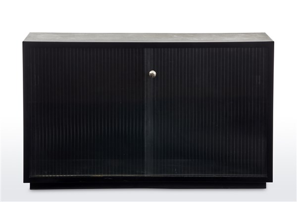 Console inspired by Bauhaus metal furniture. Waldeck, Germany, 1949ca. Black painted metal, front with sliding glass doors, internal shelves. Original key. (130x76x37.5 cm.) (slight defects)
