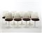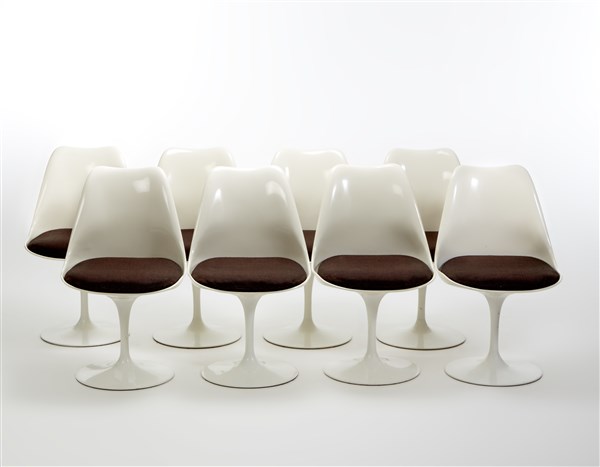 Gruppo di otto sedie modello "Tulip". Probabile produzione ICF. Italia, 1955ca. Fusione di alluminio e vetroresina trattata di colore bianco, cuscini in tessuto marrone. (cm 49,5x82,5x50) (lievi difetti)